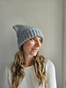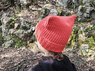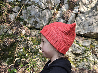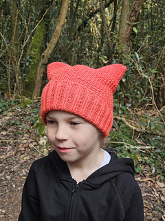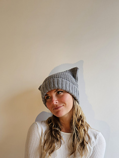 The hat features a flat top construction and is finished without any decreases. This creates soft, ear-like corners when worn.