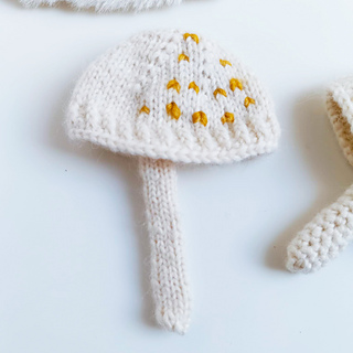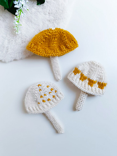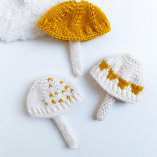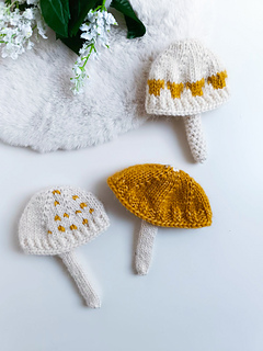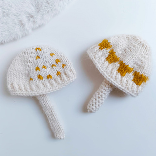 The mushrooms are worked in the round with a simple top-down cap and a straight knitted stalk, making them a great introduction to small-circumference knitting. Optional colourwork and embellishments allow you to personalise each piece, so no two mushrooms need to look the same.
