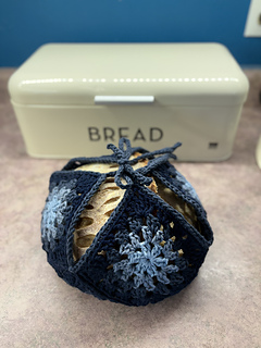 This crocheted carrier is made with simple granny squares that are slip stitched together with a cute trim and ties.