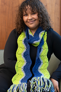 Create this easy three color ripple stitch scarf for the sports fan in your life! Worked side to side, the length can be easily customized as the ripple stitch pattern uses a multiple of 14 stitches plus two for the starting chain.