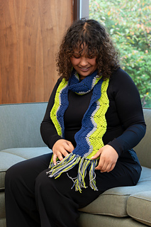 Fringe for scarf was created by using 1 strand each of Main Color A and Main Color B, plus 2 strands of Accent Color. Knot fringe evenly across bottom edges of scarf.