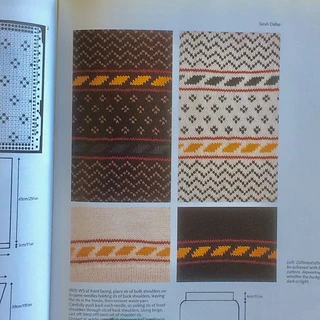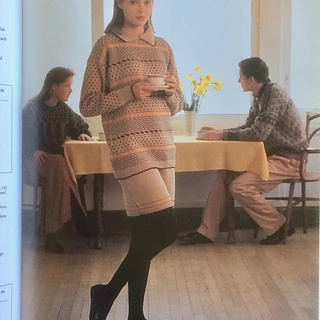 From the book: “The collared tunic is striped with spot and chevron bands, the spot pattern is echoed on the sleeves and there is a matching border on the otherwise plain skirt. In the background Edy Lyngaas’ Grotesque and Jane Davies’ Scarp sweaters can be seen.” … “Different effects can be achieved with this pattern, depending on whether the background is dark or light.”