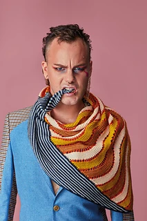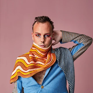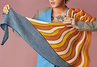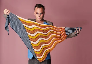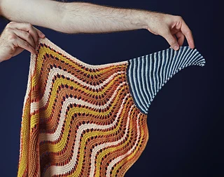 This squiggly shawl was inspired by the Speckle & Pop shawl with its graphic short rows and eyelets. This new shawl features three colors that wave and wiggle using increases and decreases. Short row wedges are highlighted with eyelet rows using a mohair silk contrast color. The squiggles are framed with graphic short row stripes for the wingtips, so you can wrap and tie the playful shawl around your neck.