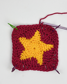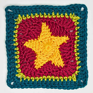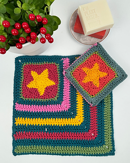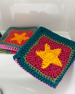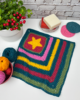 The design starts with a small granny square featuring a bright star motif at the centre, then simple rows are added along two sides to form a clean mitred shape. It’s quick to make, easy to customise, and ideal for using up leftover cotton yarn.