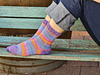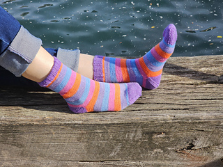 The socks are knit as a continuous tube, starting with a ribbed cuff and working through the leg and foot to the toe. Once the tube is complete, the toe is closed and the heel is added afterwards using an afterthought heel. This construction allows uninterrupted striping and makes it easy to knit two identical socks, especially when working with self-striping yarns.