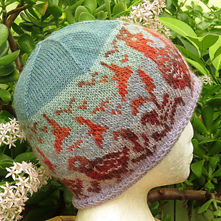 A parade of chickens around this beanie - rooster, hen and 3 or 4 chicks, depending on the size knitted.
