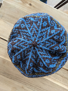 “This unisex hat, named after a small village on the Isle of Skye, has been knitted using 100% Shetland wool in the colours of the land and the sea,” explains designer Outi Kater. “The stitch patterns include waves in the body of the hat and an eight-pointed compass rose on the crown.” The stripy ribbed brim can be turned up to make this hat extra cosy and warm.
