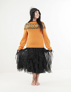 Sunshine Reggae is a stranded colorwork sweater inspired by Laid Back’s song from 1982. It is knit top down in the round with a circular yoke. The yoke has rows with 3 strands, so the pattern is suitable for slightly more experienced knitters.