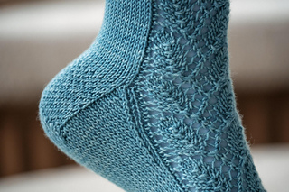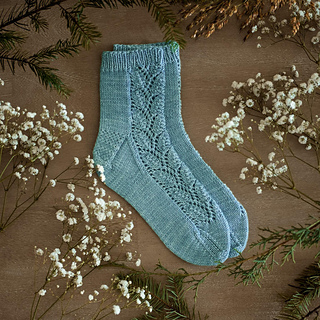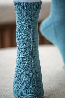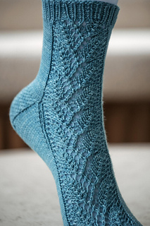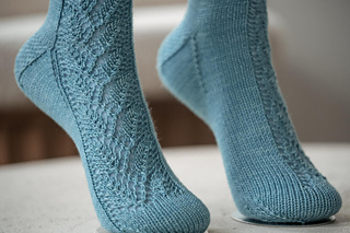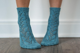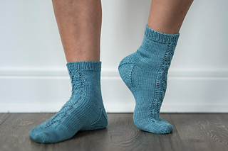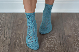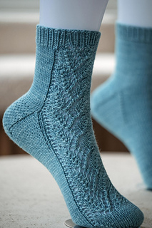 Intermediate: This pattern is for those who feel comfortable with knitting and have made a few projects, using various skills and techniques. Skills/concepts include working in the round, lace stitches, sock construction and shaping, and Kitchener stitch.