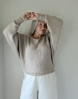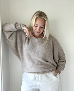 Sway Away Sweater on ultimaattisen rento, mutta samalla tyylikäs lepakkohihainen pusero, joka neulotaan tavallisesta poiketen sivuttain. Neuloksen pinta kulkee siis poikittain tässä kädentieltä kädentielle neulotussa paidassa. Neuleessa on napakat pitkät resorit kädenteillä ja leveä venepääntie, joka saa hiukan valahtaa niin, että olkapää vilahtaa. Leveät lepakkohihat ulottuvat vyötärölle ja helmaan neulotaan kaunis joustinneule kuromaan muuten rentoa puseroa kasaan.