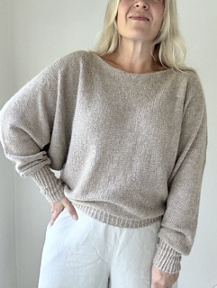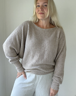 Since this is a batwing-style sweater, the best way to choose your size is based on your waist circumference, as the waist is the narrowest point of the sweater. The sleeves are intended to be very roomy, draping naturally over the cuffs when worn. If the boat neckline feels too wide once finished, it’s easy to adjust by sewing a few centimeters together at the edges.