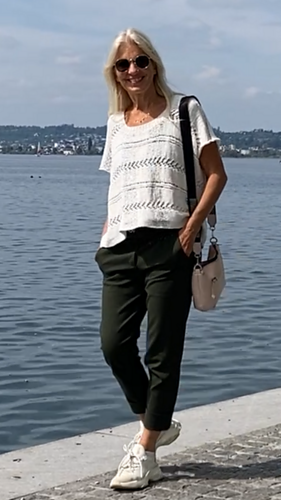 Trägt sich einfach traumhaft und erhält durch die verschiedenen Tragevarianten und den wunderschönen weichen Fall der Baumwolle ständig einen neuen Look. Im Vokuhila-Look darf auch mal die Haut etwas durchblitzen, dafür muss man nicht mega schlank sein, da von der Seite längere Teile nach vorne schwingen. Am Besten siehst du das im Video (coming soon).