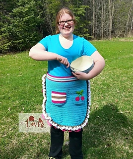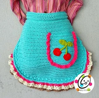 Sample: 360 yards of main color/ Red Heart Aruba Sea (center of apron and waistband tie), 120 yards of pink, cream and tan. Small amounts of lime green and red.