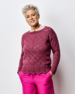 “A bouquet of flowers provided the inspiration for this sweater design,” says Emma Vining. “The garment features a lower section representing the stems and leaves, and an upper section full of beautiful blossoms. The lower borders are knitted with a combined pattern of three-stitch cable stems and textured feather and fan pattern leaves. This stitch pattern forms a dramatic pointed lower edge with the cables placed between each point.”