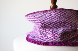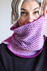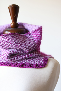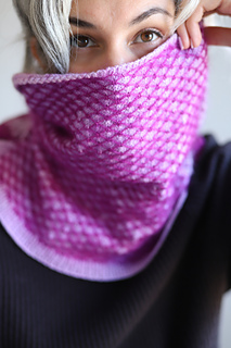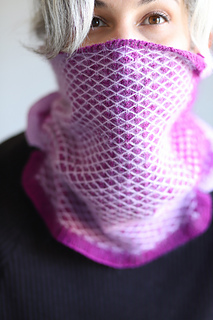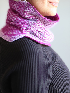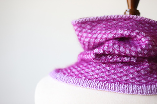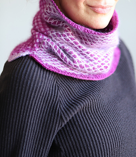 I designed this cowl using a fun and engaging 2 color slipped stitch pattern with fingering weight yarn and mohair lace. It’s knit flat in two pieces, then seamed together creating a cowl with a split hem. You can make it a 4 color cowl like mine or a simple 2 color cowl if the extra color play isn’t for you. There are 3 size options to choose from and as always, the length is customizable.