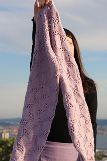 Worked from one side with a small number of stitches and gradually increasing until the final width is established, the scarf then decreases down the other side. Lacework instructions, including through the increase and decrease sections, are both written and charted.