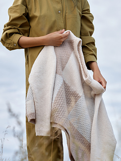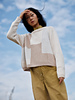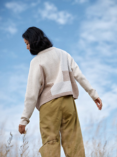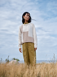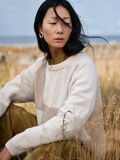 Casual yet elegant, it is a timeless staple and cosy companion. The sweater is worked flat from the top down using intarsia for the patchwork. Hem, neckband and sleeves are then completed in the round, with each colour worked in its own stitch pattern.