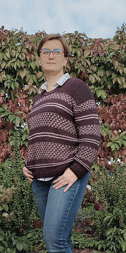 Yarn used in the sample (size 2) is 4 skeins of Moondrake DraKe (85% Fine Superwash Merino, 15% Mulberry silk; 225 m 246 yds / 100 g) in colourway Aubergine as the Opaque Yarn and 2 skeins of Moondrake Kinu Momo (60% Kid Mohair, 40% Mulberry silk; 300 m 330 yds / 25 g) in colourway Timeless as the Sheer yarn.