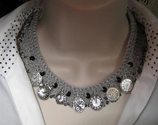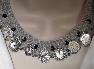 This is a whimsical necklace made with a glittery yarn, glass beads and silver clock charms. It is easy to make with only 7 rows of work. This is the perfect gift for anyone who wants to be reminded that it is “Time to Knit”! Have fun with this project!