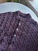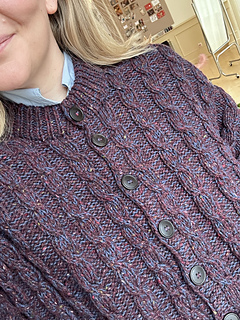 The cardigan is knit top down in a cable pattern. First, the back and fronts are worked flat to the bottom of the armhole, then the pieces are joined and the body is continued flat. The sleeves are knit down from stitches picked up along the armhole and shaped with decreases. Finally, the neckband is worked and the cardigan is finished with buttons.