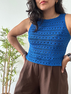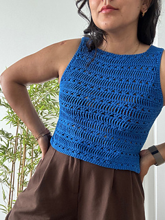 El Top Simbiosis es un proyecto de crochet que combina distintas tramas de puntos para crear una prenda simple, moderna y femenina, perfecta para los días más cálidos de primavera y verano. El diseño se compone de dos piezas iguales, tejidas por separado de abajo hacia arriba, que luego se unen en los hombros y en los laterales. Podrás ajustar el largo y personalizarlo fácilmente según tu estilo y preferencia, una vez que comprendas la dinámica del tejido.
