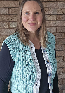 This intermediate-level pattern features textured rows worked in the third loop, gentle shaping, and a buttoned front, creating a versatile piece that can be styled across seasons. The construction is worked flat from side to side, with the body completed first, followed by ribbing and finishing details.