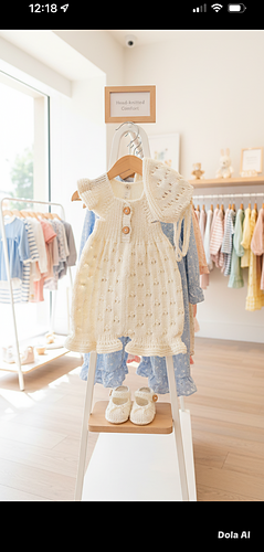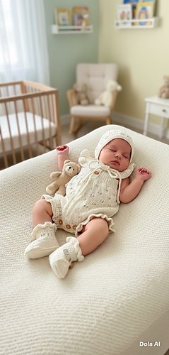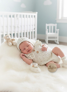 A pretty romper pattern with a matching bonnet and shoes. Knitted on straight needles back and forth with line-by-line instructions. The romper is knitted from the top down, so minimal sewing is needed. It buttons up with 2 buttons on the back but can be worn with the buttons on the front. The bonnet is also knitted from the top-down and the icord ties can be added without any sewing required. The little shoes are quick to knit up and complete this beautiful little set