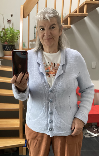 Any yarn matching the gauge. The cardigan should have a certain solidity to emphasize the character of a jacket. I would recommend to knit rather tightly and not to use a very smooth yarn.