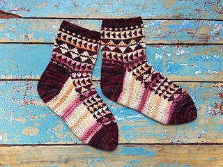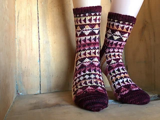 This sock pattern by Fiona Munro is fun, original and can of course be knit in many varieties of colors! Use your imagination! These socks are knit from the ribs to the tip of the foot in jacquard.