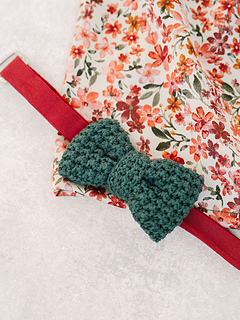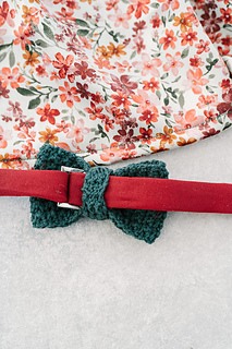 The bow tie is worked flat, in two pieces, and assembled together. The neckband is made from a recycled bow tie, replacing the old bow with the new crochet version. You can also use a ribbon and a hook & eye closure as an alternative.