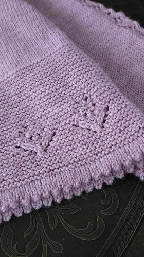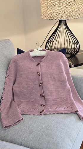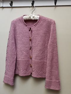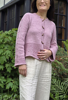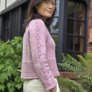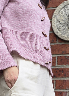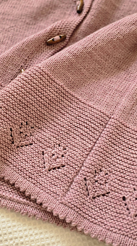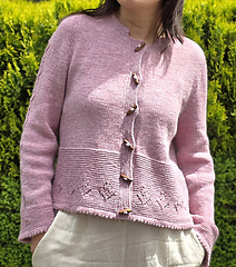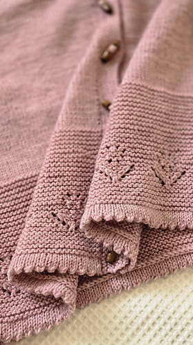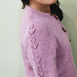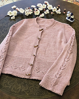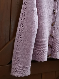 Once the body is complete, start working on two sleeves in the round. The sleeve has a row of tulip laces flowing from the top of the sleeve cap right to the end of the sleeve. The cardigan is finished with a folded picot edge at the bottom of the lower body, sleeve cuffs and collar. Finally pick up the stitches along the front edges and knit in garter stitches to complete the two front bands.
