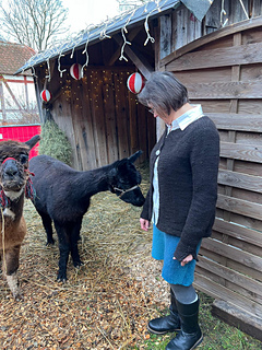 Beige: 1 Faden Kidsilk +1 Faden Alpaca + 1 Faden Baumwolle. Blau: Lamana Como Grande in Farbe Basaltblau.