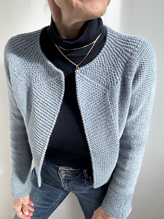 Jedes Garn das zur Maschenprobe passt – Aran (ca. 70-80m per 50g) oder mehrere dünne Fäden zusammengenommen. Ich empfehle ein weiches Material, das auch auf der linken Seite schön eben aussieht, damit die Jacke gewendet werden kann (klick für Inspiration). Siehe Seite 2 für Garnmengen.