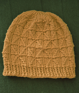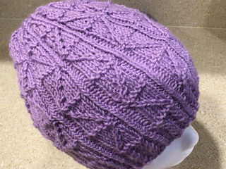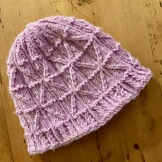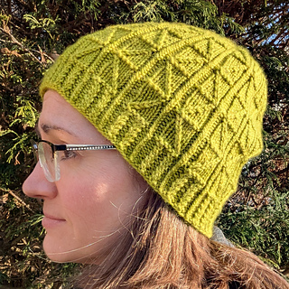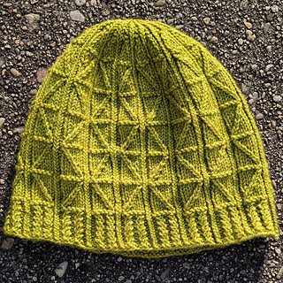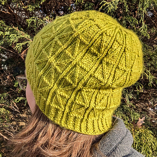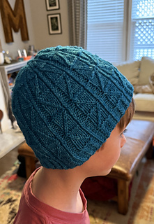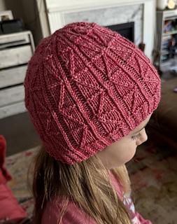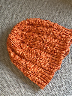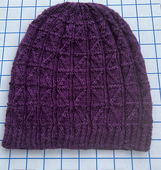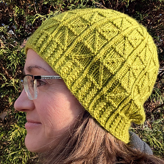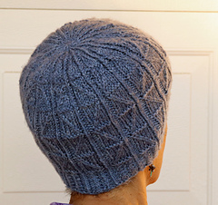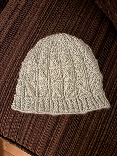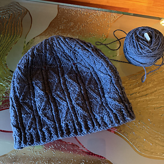 Twist in a Box is worked in the round beginning with twisted stitch ribbing around the brim. Single columns of stitches knit through the back loop divide the sections of twisted stitches. Decreases in pattern shape the crown.