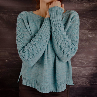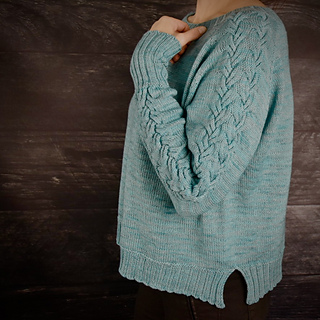 Because the instructions are so variable, I cannot give exact details about the amount of yarn used. I used just under 450 g (approx. 1500 m), which is about 15% more than for a sweater in stockinette stitch for a body circumference of 120 cm (20% extra width) and a sleeve circumference of 42 cm.