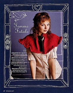 from knitscene: “Whimsical and daring, this capelet is worked in an alpaca yarn that has a gold thread running through it--a bit of unexpected glam. A dashing velvet ribbot ties at the throat like a man’s tie…or in a bow if you’re in a gentler mood.”