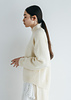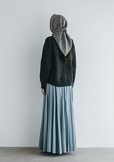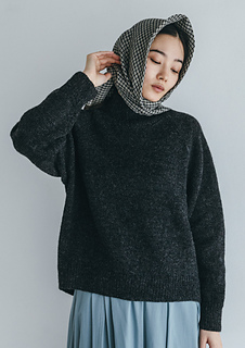 後ろ裾部分が下がった曲線のようなラウンド型が特徴的なセーターです。後身頃のゴム編み部分を編み終えた後、編み進みの引き返し編みをしながら裾の丸みを出します。裾広がりの後身頃とは逆に、裾の狭まった前身頃をドッキングすることで立体感のあるラウンドした裾の形に仕上がります。袖は深めのラグランのラインで、カジュアルさを感じるメンズライクなシルエットです。衿はキュッと詰まったリブに仕立てます。