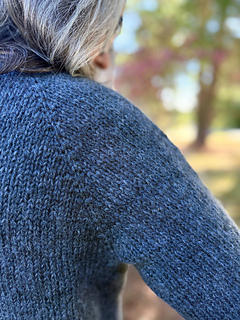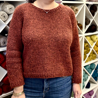 The sweater is knitted holding two strands together. Rauma Fivel which is a worsted weight yarn is held together with Rauma Plum and is knitted on a US 10 or size needed to meet gauge. The finished sweater is a relaxed fit with 3/4 length sleeve, round neck and split hem.