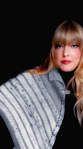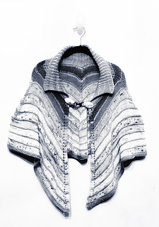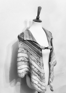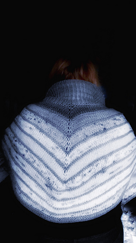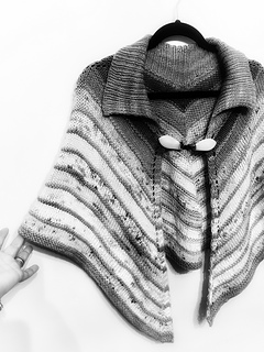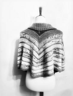 Worked in DK-weight yarn, this capelet features a golden main color paired with 10 hand-dyed contrast-color mini skeins, creating a stunning gradient and retro-inspired stripe effect. The construction includes a ribbed faux collar that drapes gracefully along the wrap, plus three elegant increase spines that shape the shoulders and the V-shaped center back for perfect drape and symmetry.