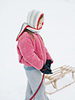 A hooded scarf in garter stitch, composed of a combination of Variations on Triangle shawl and a balaclava structure. It is available in two fitting types: “snug-fitting” with the hood fitting snugly around the face and roomy “loose-fitting”.