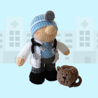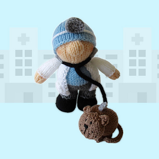 Victor the Veterinary takes care of your pets, and today a cat is having their check up. Designed by Amanda Berry @fluffandfuzz, these toys are knitted in acrylic DK yarns. Work most pieces flat (back and forth) on single pointed knitting needles, not in the round. The DPNs are used to knit i-cord tubes for the stethoscope and cat’s tail and legs. Victor’s head mirror strap is a single crochet chain worked on a crochet hook.