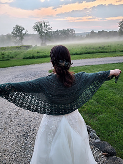 This top-down constructed crescent-shaped shawl features squishy garter stitch sections interspersed with leaves and finished off with the word “woodland” as a lace stitch pattern created by Naomi Parkhurst. She has a unique technique of encoding words as numbers and then charting them. Learn more about her fascinating process here.