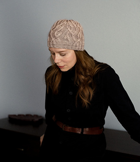 A tangle of intertwining cables gives this hat both texture and elegance. The design features vertical columns of asymmetric cables that flow seamlessly from the ribbed brim to the crown, creating a fluid, architectural look. The rhythmic cable pattern makes for an engaging knit with satisfying results.