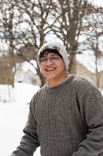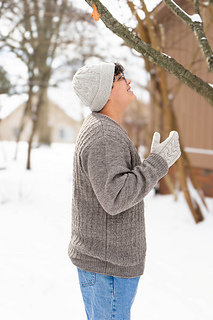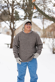 Sample shown is the crewneck version knit in Bare Naked Wools Finn Dandy 3-ply Sport, color Wolf