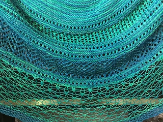 Note: The final lace is less dense than the rest of the shawl. I like it that way but if that’s likely to bother you, just start using your yarn double when you change needles. You will either need more yarn or do fewer repeats (I did the maximum to show how far the yarn will go used single but 1/2 is plenty).