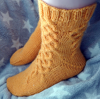 The socks are knitted as mirror images. The cable panel run on the outer side of the foot and new cables emerge from each side of the leg, like they would become your every steps. The cables tell their own story of different times in your life, whether happy or sad, it’s all there on your life’s path.