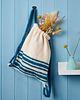 This versatile drawstring bag is ideal for the beach, for shopping trips or even for storing your work-in-progress. The front and back pieces incorporate a folded channel at the top, through which are threaded two long strips of i-cord; two small loops are knitted and attached to the bottom of the bag, through which the drawstrings are anchored.