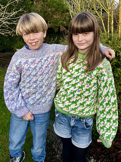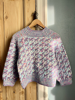 25 masker • 28 pinde i tofarvede rib på hals, ærmer og krop på pind 3,5 mm = 10 • 10 cm