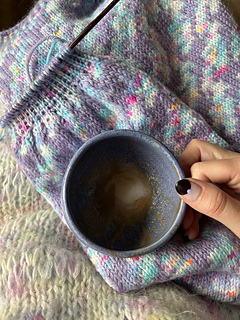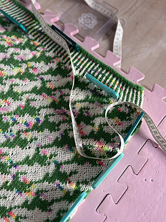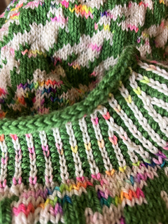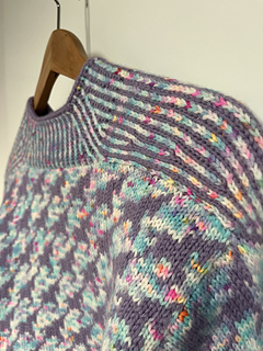 The work is joined and worked in the round following the chart. At the base of the armholes, the steek stitches are bound off, and the body is worked straight down in pattern. The body is finished with a two-color rib edge and an i-cord bind-off in a single color.