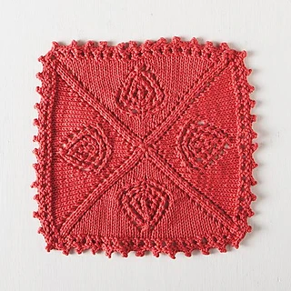 This pretty dishcloth is cast on from the center using a crochet hook and knit in the round. The increases form a square shape, embellished with four lace rosebuds. A picot trim adds a delicate touch.
